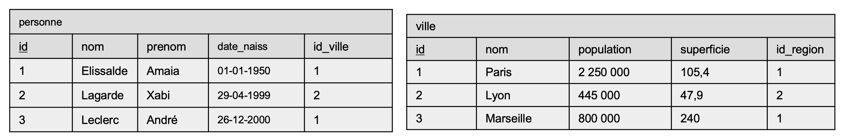 Données : 3 enregistrements par table