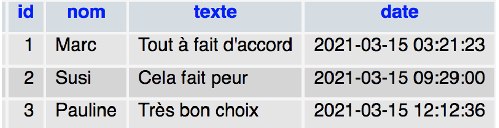 Exemple : Table commentaire