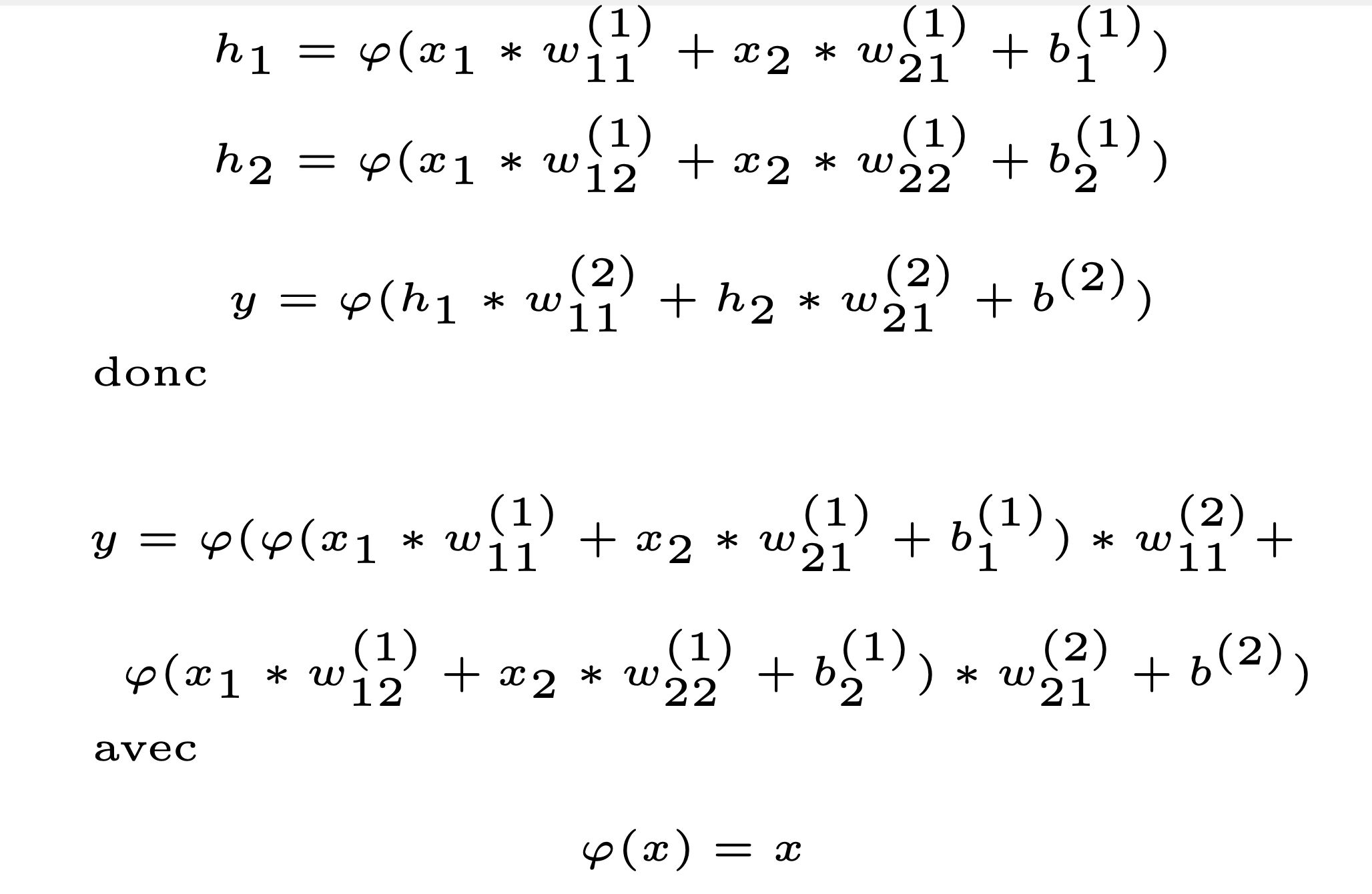 avec une fonction d’activation linéaire \(\varphi{x}=x\), c’est simplement une combinaison linéaire, et la couche de sortie n’apporte rien