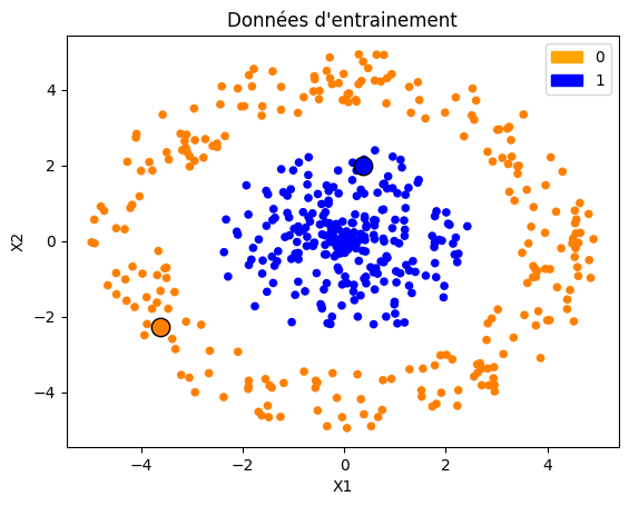 Voici un exemple : les données d’entrée 2D sont caractérisés par des points, et la sortie correspondante est la couleur, ici bleu pour 1, et orange pour 0. Ici, il y a 500 données étiquettées (labeled data).